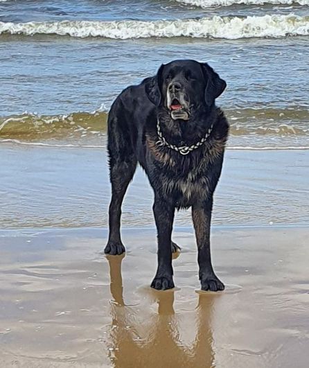 Er muss leider schweren Herzens zeitnah ein neues Zuhause finden und umziehen, da sein Besitzer wegen schwerer voranschreitender Erkrankung über kurz oder lang nicht mehr in der Lage sein wird, sich um ihn zu kümmern!! Asgard ist 9 Jahre alt, ein typischer Mix aus Deutscher Dogge (Mutter) und Neufundländer (Vater) mit aktuell 70kg und seit Welpenalter bei seinem Besitzer. Er ist sehr menschenbezogen, ein Kampfschmuser und absolut loyal. Ein sehr liebevoller Begleiter, der seinen Mix-Rassen alle Ehre macht: er liegt gerne im Weg, ist einfach gerne dabei und hat sein Territorium zuverlässig im Blick. Er kann aber auch problemlos mehrere Stunden alleine bleiben und ist ein insgesamt typisch gelassener Zeitgenosse.